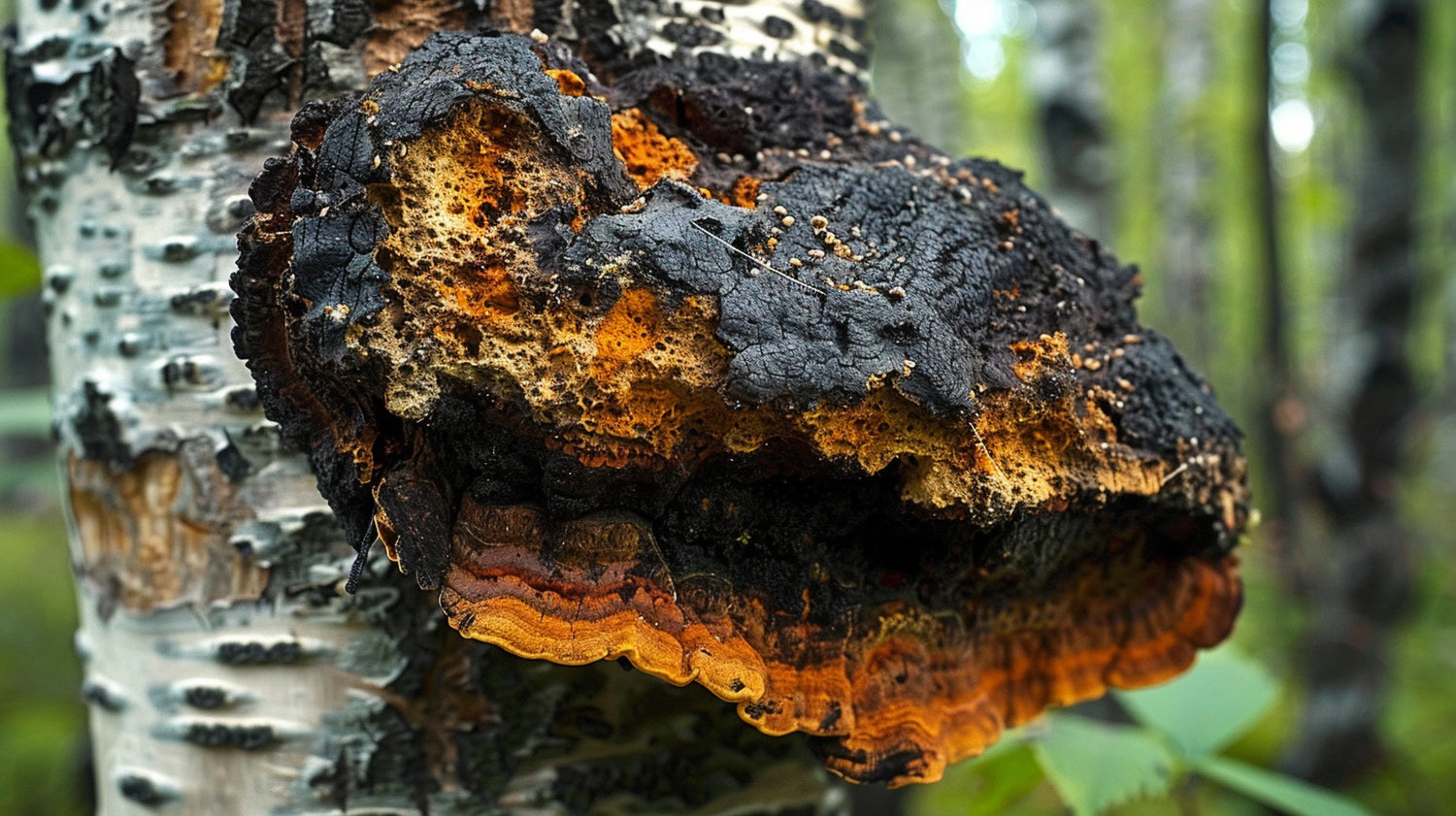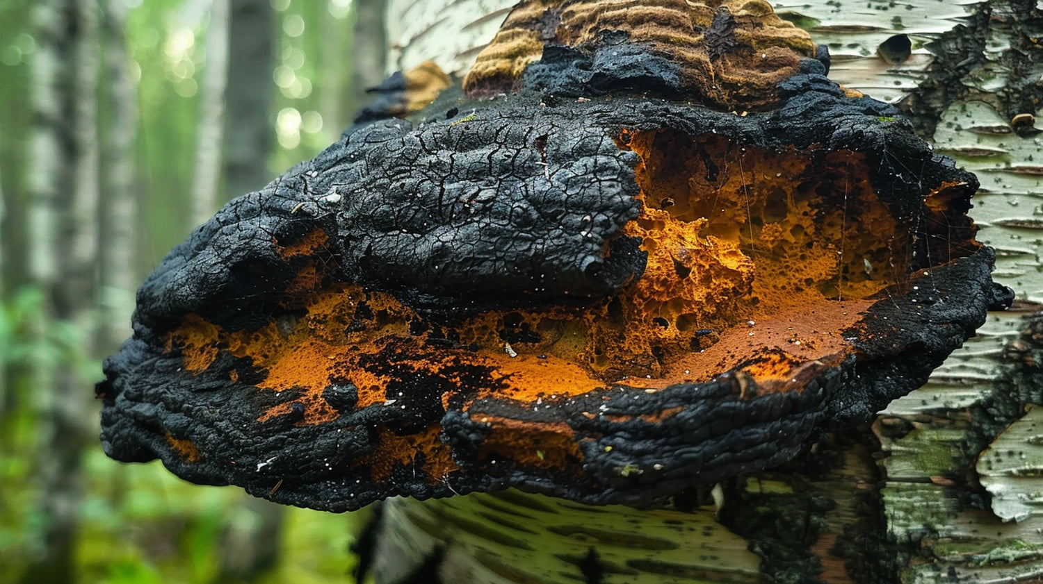 Chaga mushrooms, scientifically known as Inonotus obliquus, are a type of medicinal mushroom that grows on the trunks of birch trees in cold climates like Siberia, Canada, and Alaska. Its unique dark, lumpy exterior and smooth golden interior have earned it the nickname "Black Gold."