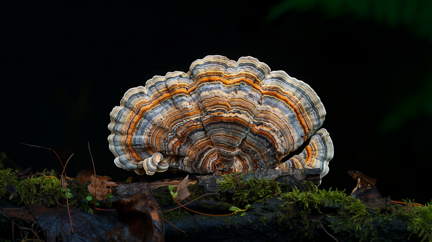 Turkey Tail mushroom, known scientifically as Trametes versicolor, belongs to the Polyporaceae family. This mushroom grows on dead or decaying trees, logs, and stumps. It gets its name from its striking resemblance to the tail feathers of a turkey, displaying concentric rings of colors like brown, grey, blue, green, and purple. It is fan-shaped with a velvety texture and a thin, leathery surface.